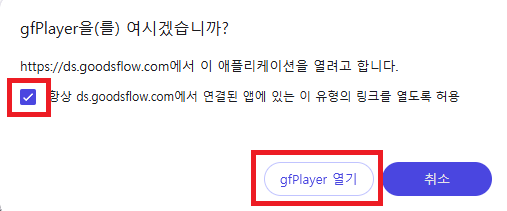 ③ 팝업이 나오면 [항상허용]에 체크 하고 [gfPlayer열기] 버튼을 누릅니다.