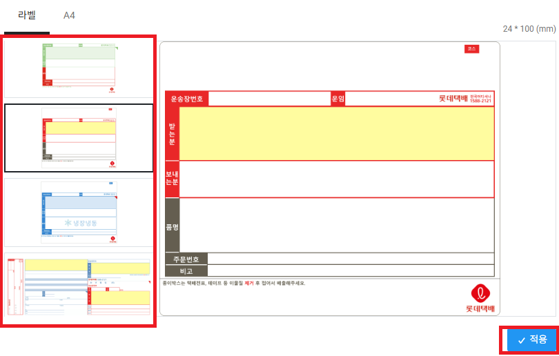 ③ 사용하는 운송장을 선택하고 [적용] 버튼을 누릅니다.