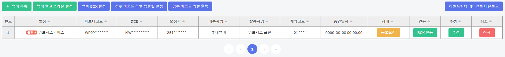 한창고에 같은 택배사 두개 | 포천창고 | 롯데택배(439****) | 연결불가능 (코드가 달라도 불가) |