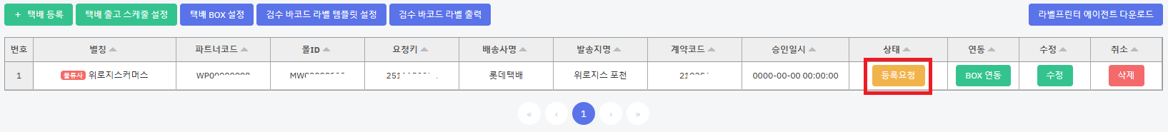 ⑧ 택배사 리스트 ‘상태’의 [등록요청]버튼을 누릅니다.