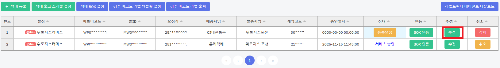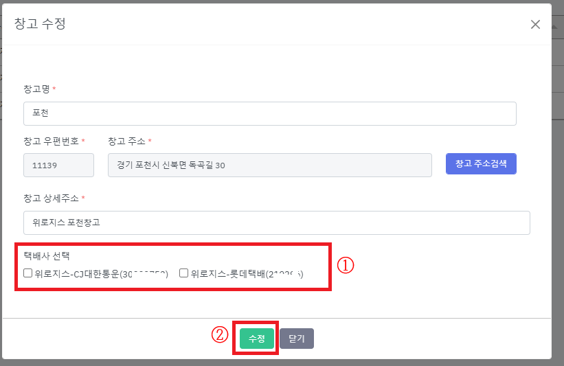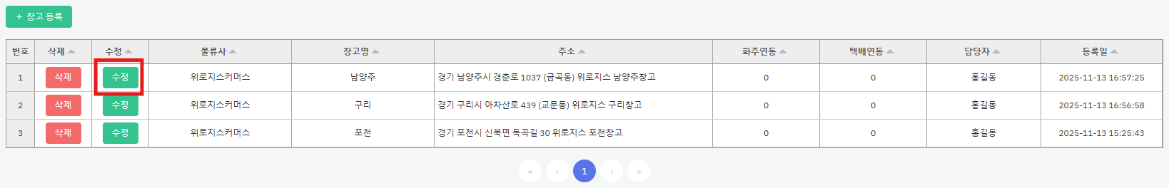 ② 리스트에서 연결하고자 하는 창고의 [수정] 버튼을 누릅니다.