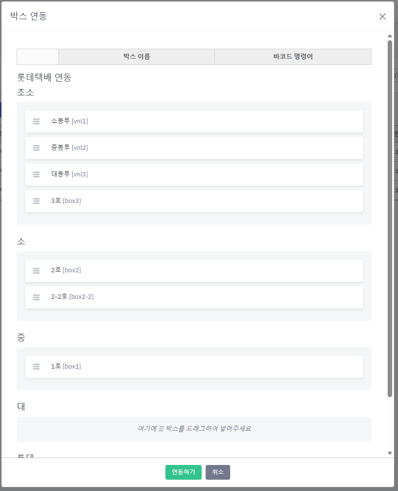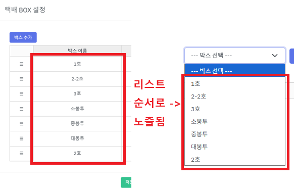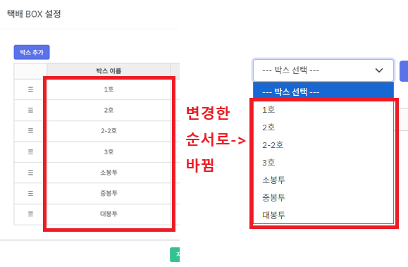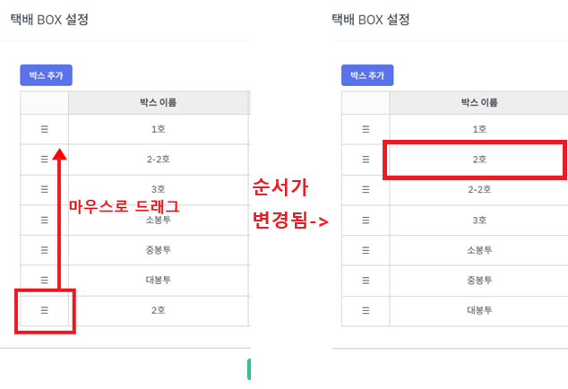 여러개의 박스가 등록된 경우 검수단계(검수화면)에 노출되는 박스 순서를 변경 할 수 있습니다.