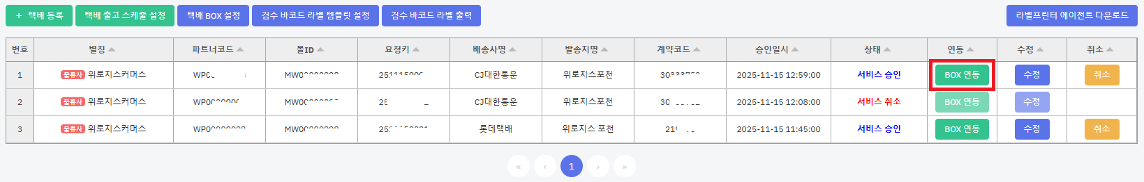② 택배사 리스트에 [BOX연동] 버튼을 누릅니다.