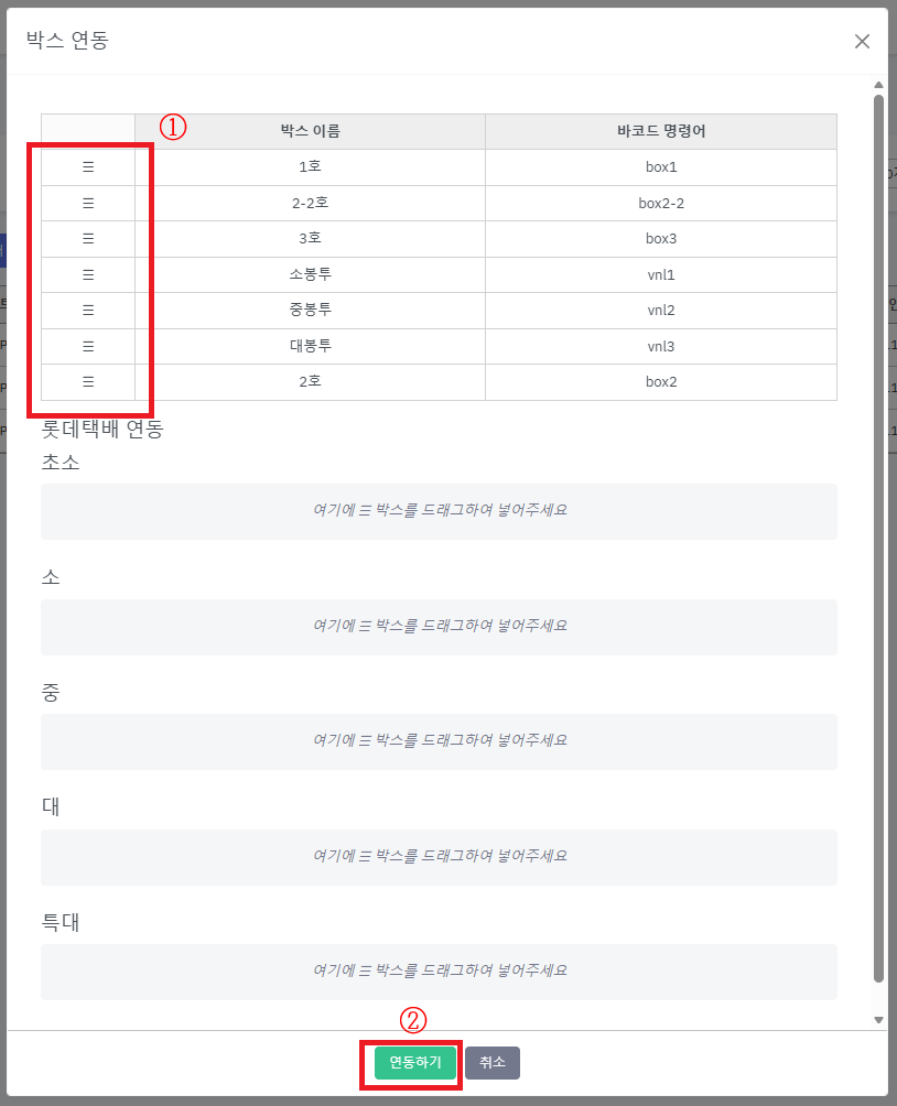 ① 박스이름 왼쪽에 삼단바를 마우스로 드래그하여 박스를 택배구간으로 이동(배치) 시킵니다.