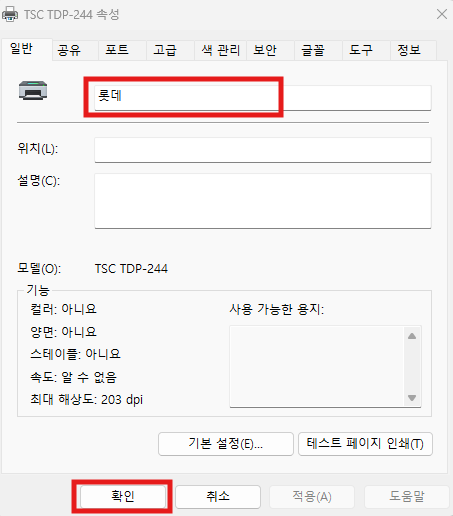 이때. 프린터 이름은 동일하게 기입해 주셔야 합니다.
