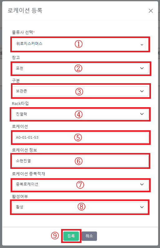 ![]() | ① 물류사를 선택합니다. ② 창고를 선택합니다. ③ 구분을 선택합니다. 💡 로케이션 구분이 모호 할 경우 [보관존]을 선택해 주세요. ④ Rack 타입을 선택 합니다. 💡 타입구분이 모호 할 경우 [진열랙]을 선택해 주세요. ⑤ 로케이션 이름을 입력 합니다. 💡 로케이션 이름은 ‘영문소문자’ , ‘영문대문자’ ,‘숫자’ , ‘-’ 을 사용할 수 있습니다. 예) D0-05-03-13, PLT-001, a0-01 ⑥ 로케이션 설명을 간단하게 입력 합니다. 공란으로 두셔도 됩니다. ⑦ 중복적재여부를 선택 합니다. 💡 [중복로케이션]을 선택하면 한 로케이션에 여러가지 상품을 연결 할수 있습니다. [단일로케이션]을 선택하면 한 로케이션에 한 상품만 연결 할수 있습니다. 선택이 어려우시면 [중복로케이션]을 선택 해 주세요. ⑧ 활성화 여부의 [활성]을 선택합니다. ⑨ [등록] 버튼을 누릅니다. |