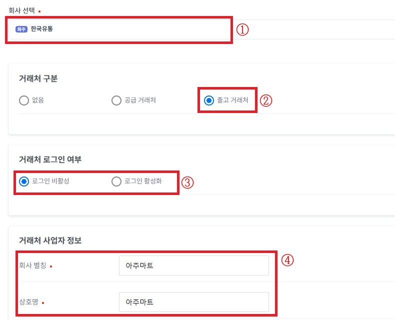 [로그인활성화]를 선택 하시면 거래처 회원정보를 입력할 수 있는 필드가 나타납니다.