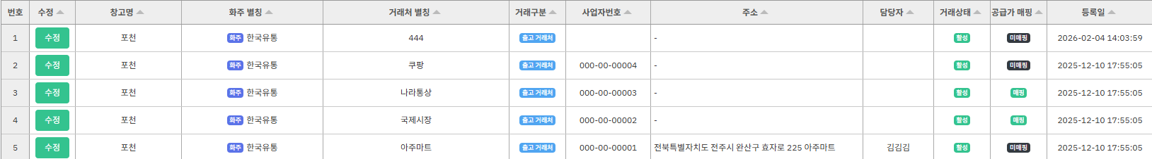 4) 등록된 거래처를 리스트에서 확인 할 수 있습니다.