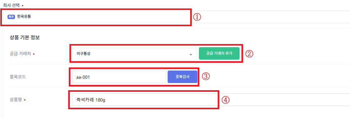 품목코드를 기입할 경우 [중복검사] 버튼을 눌러 주세요.