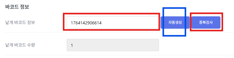 [자동생성] 버튼은 상품에 바코드가 없는 경우 바코드를 강제로 부여하는 기능입니다.