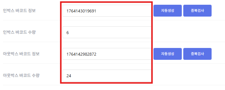 ③ 인/아웃박스 바코드와 수량을 기입 합니다.