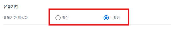 ① 유통기한이 없는 상품의 경우 유통기한 활성화의 [비활성]을 선택 합니다.