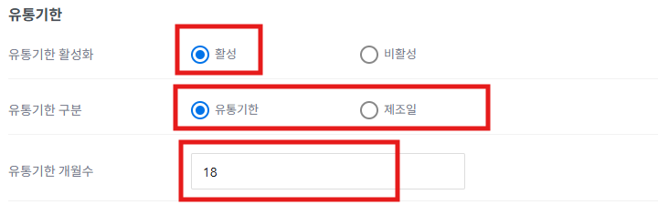 ② 유통기한이 있는 상품의 경우 유통기한 활성화의 [활성]을 선택 합니다.