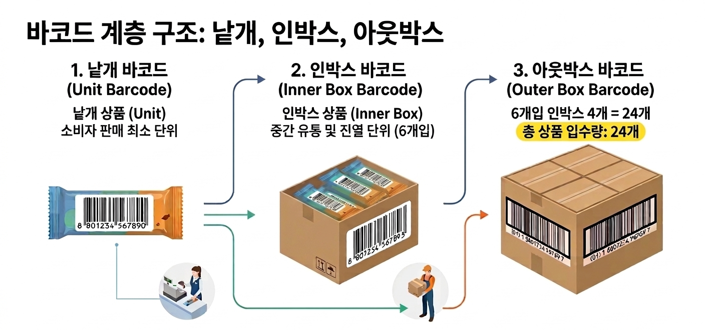 낱개, 인박스, 아웃박스의 개념은 다음과 같습니다.