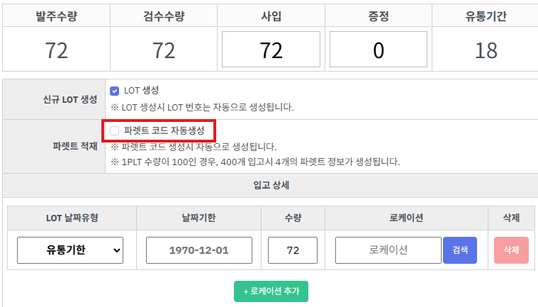 파렛트 코드자동생성 기능을 사용하면 입고 수량을 파렛트 입수량으로 인벤(로케이션) 자동 분할합니다.