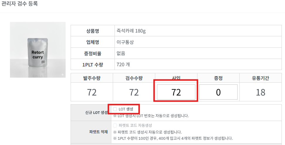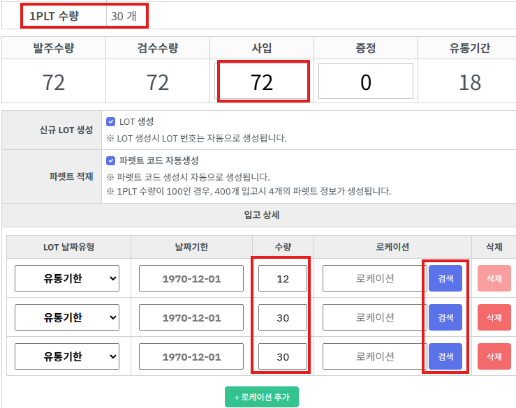 step2. 상품등록시 기입한 [1PLT 적재수량]과 [입고수량]을 계산하여 [입고LOT] 이 필요 수량만큼 자동 생성됩니다.