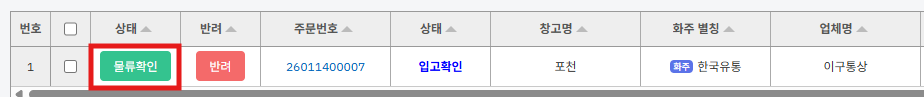 ② 등록된 입고지시가 리스트에 나타 납니다. [물류확인] 버튼을 누릅니다.