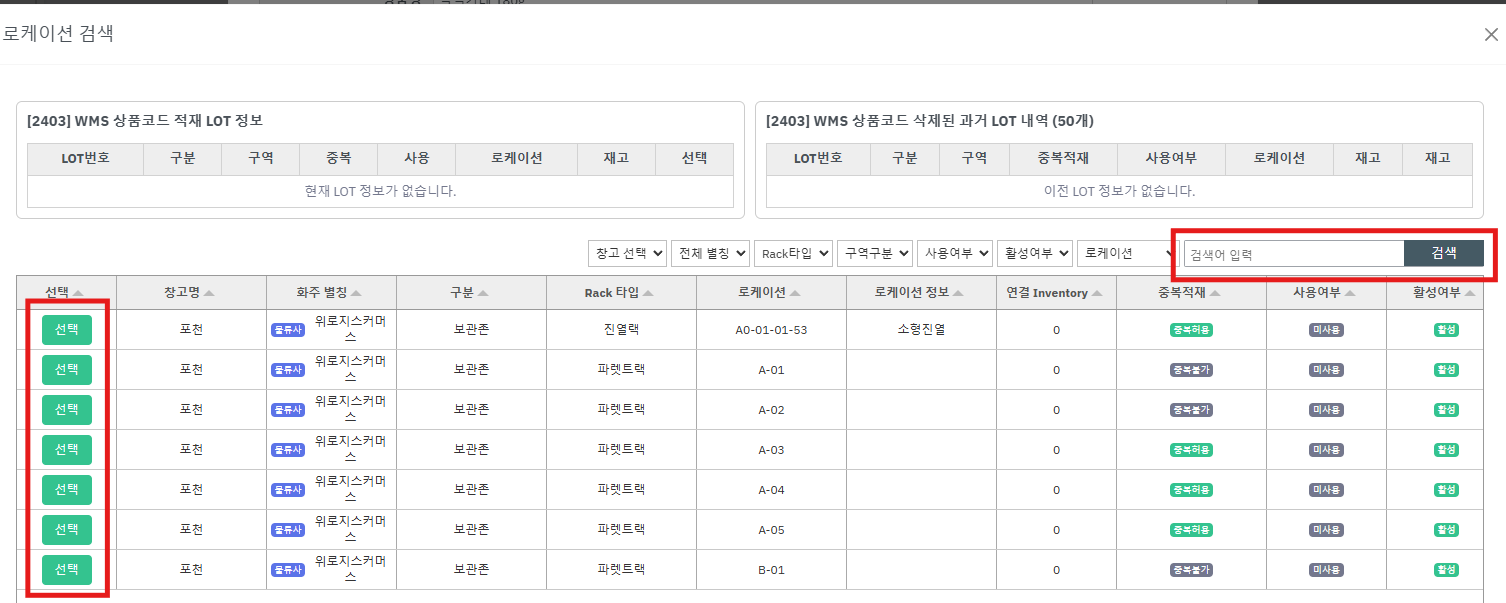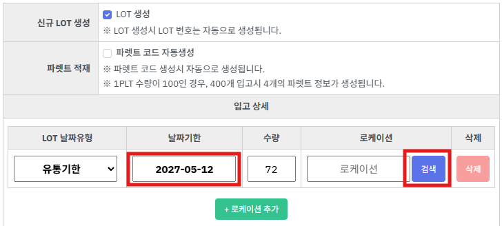 step3. 유통기한을 입력하고 로케이션 [검색] 버튼을 누릅니다.