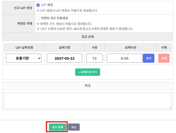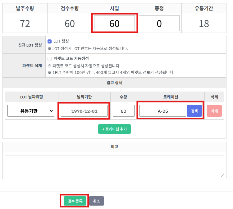 ⑦ 하단에 [유통기한], [로케이션] 입력필드가 나타납니다.
