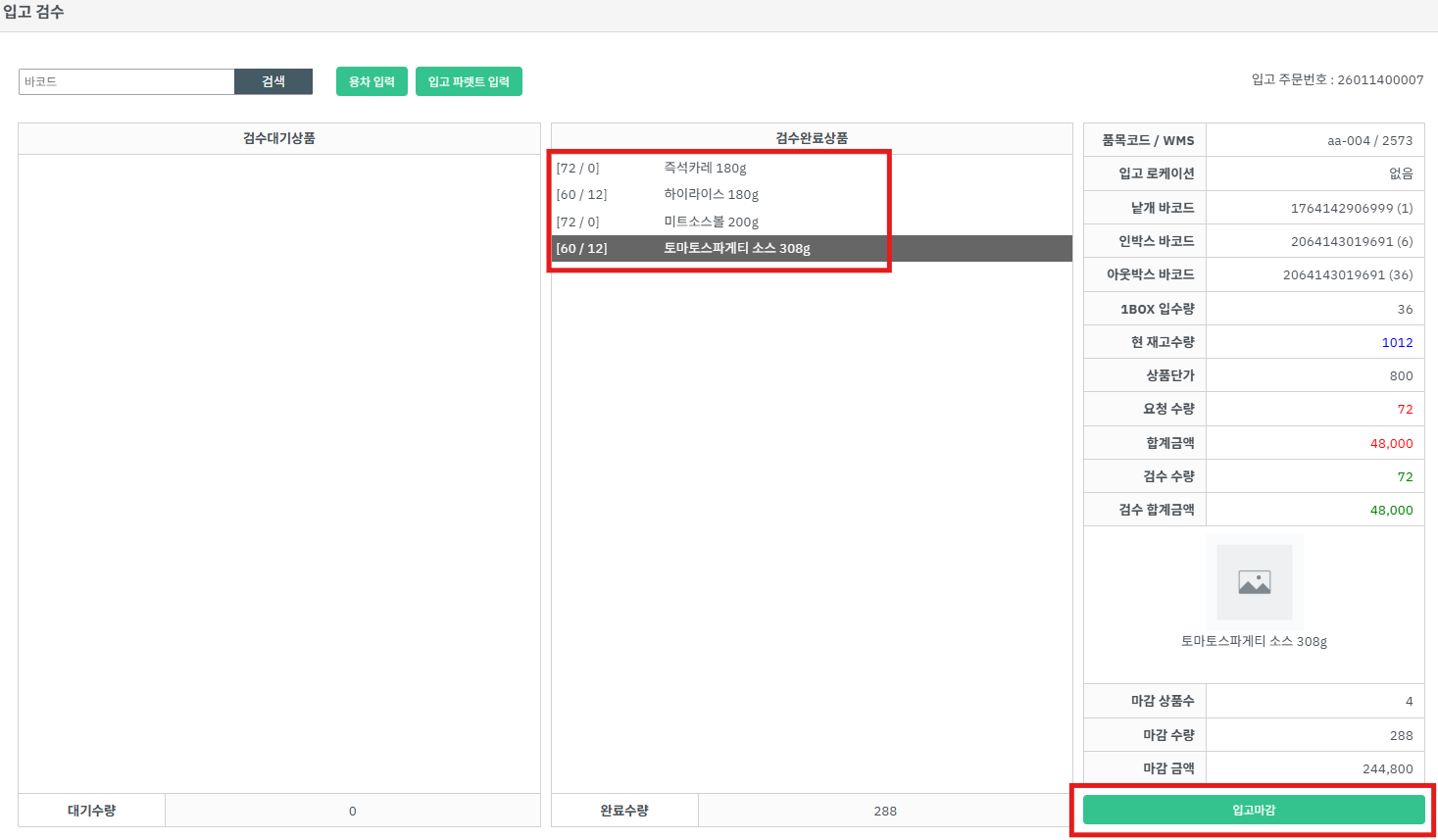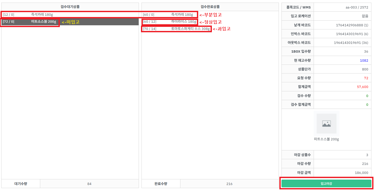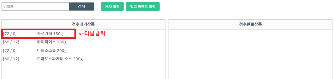 💡 예) 예정수량이 72개 였는데 60개만 검수한 경우