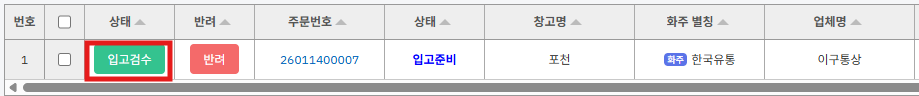 ④ [물류확인] 버튼이 [입고검수] 버튼으로 바뀐 것을 확인하고 [입고검수] 버튼을 누릅니다.