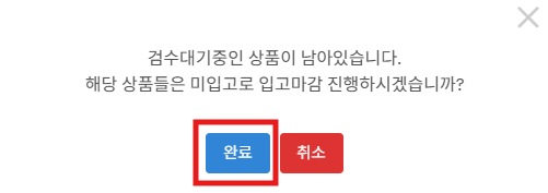 ⑦ 미검수내역 확인 팝업이 나옵니다. [완료] 버튼을 누르면 검수가 완료 됩니다.
