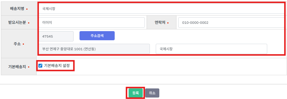 [기본배송지설정]을 체크하면 다음 입고지시 부터 해당 배송지 정보를 자동으로 가져 옵니다.