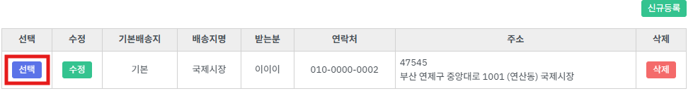 ⑥ 해당 배송지의 [선택] 버튼을 누릅니다.