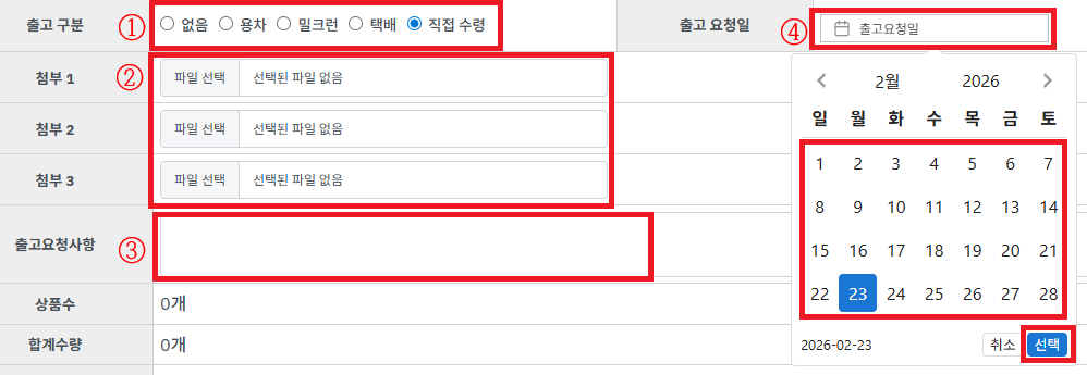 ③ 출고요청사항을 간략하게 기입 합니다. 공란으로 두셔도 됩니다.