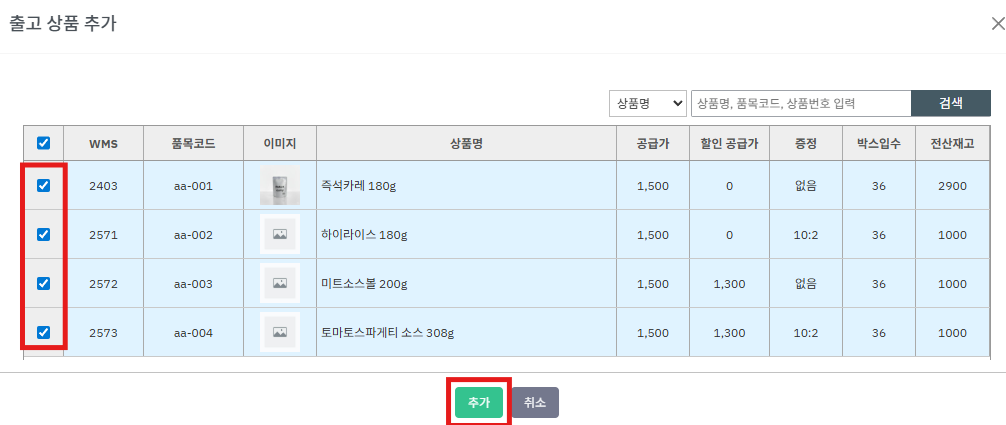 ② 상품선택 화면에서 출고할 상품을 선택하고 [추가] 버튼을 누릅니다.