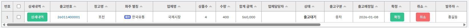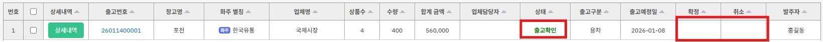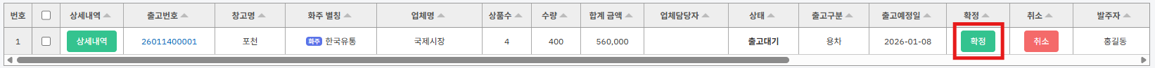 ② 출고지시를 확정하면 상태가 출고확인 으로 바뀌고 [확정], [취소] 버튼이 사라지며 출고검수 단계로 넘어 갑니다.