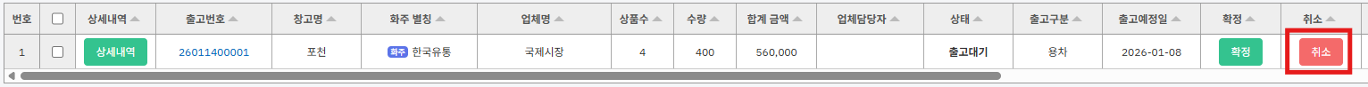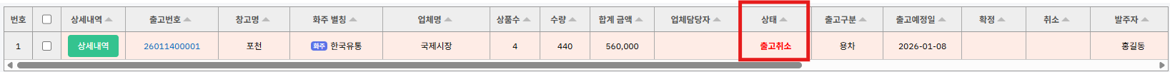 ② 취소된 건 은 상태가 [출고취소]로 바뀌며 리스트에서 빨간색으로 색인됩니다.