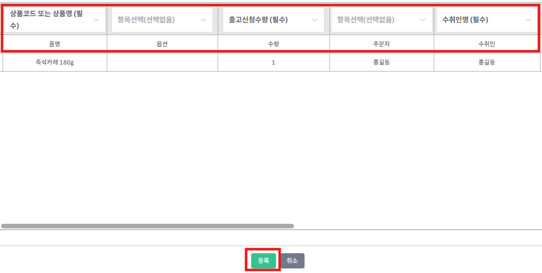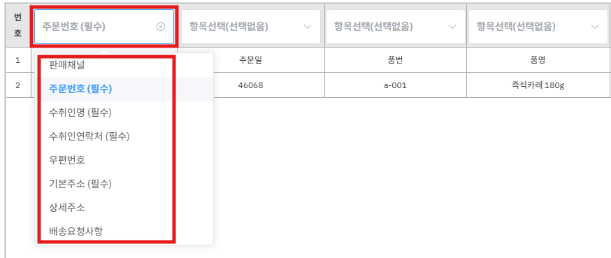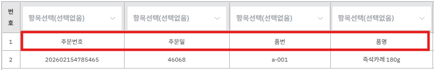 예) 헤더가 1행이고 2행부터 주문정보가 시작되면 ‘2’ 기입