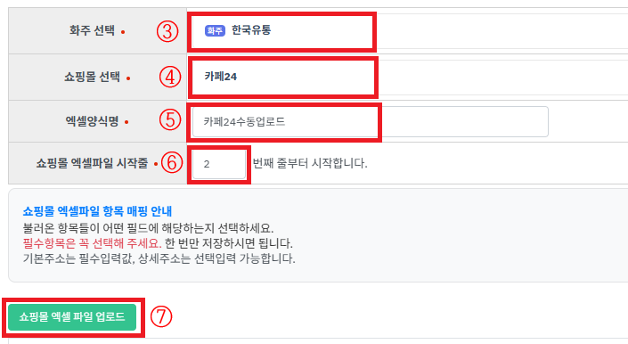 ⑦ [쇼핑몰엑셀파일업로드] 버튼을 누릅니다.