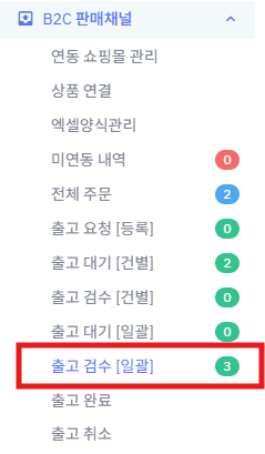 ① 왼쪽메뉴 [B2C판매채널] => [출고검수(일괄)]을 클릭합니다.
