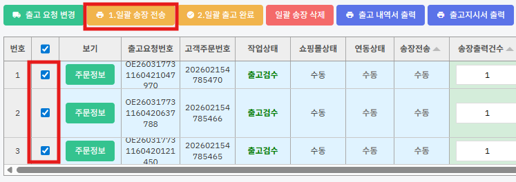 ② 주문건을 체크하고 [1.일괄송장전송] 버튼을 누릅니다.