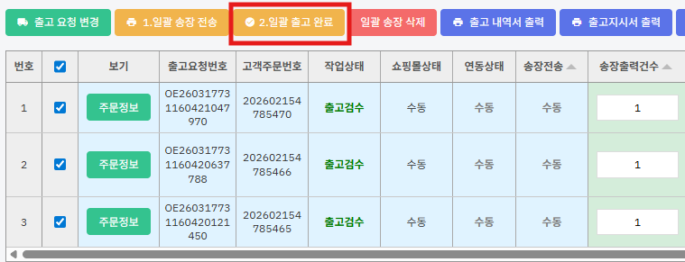 ⑤ 주문건을 체크하고 [2.일괄출고완료] 버튼을 누릅니다.