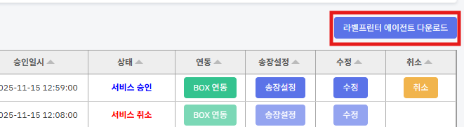 ② 오른쪽 상단 [라벨프린터에이전트다운로드] 버튼을 누릅니다.