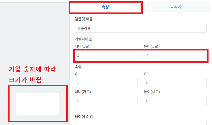⑤ [속성] 탭에서 라벨 사이즈를 기입합니다.