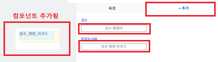 ⑦ [+추가] 탭을 누르고 [검수명령어]와 [검수명령바코드]를 한 번씩 클릭합니다.