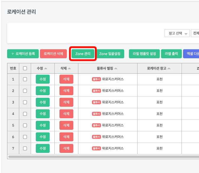 “Zone(존)” 설정은 필수사항이 아니며 물류운영 방식에 따라 선택적으로 사용하시면 됩니다.