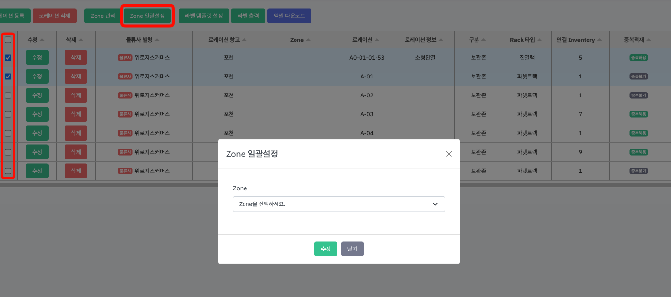 ① 매핑할 로케이션을 체크하시고 [Zone 일괄설정] 버튼을 누릅니다.