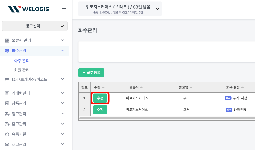 ① 왼쪽메뉴 [화주관리] => 설정할 화주의 [수정] 버튼을 누릅니다.