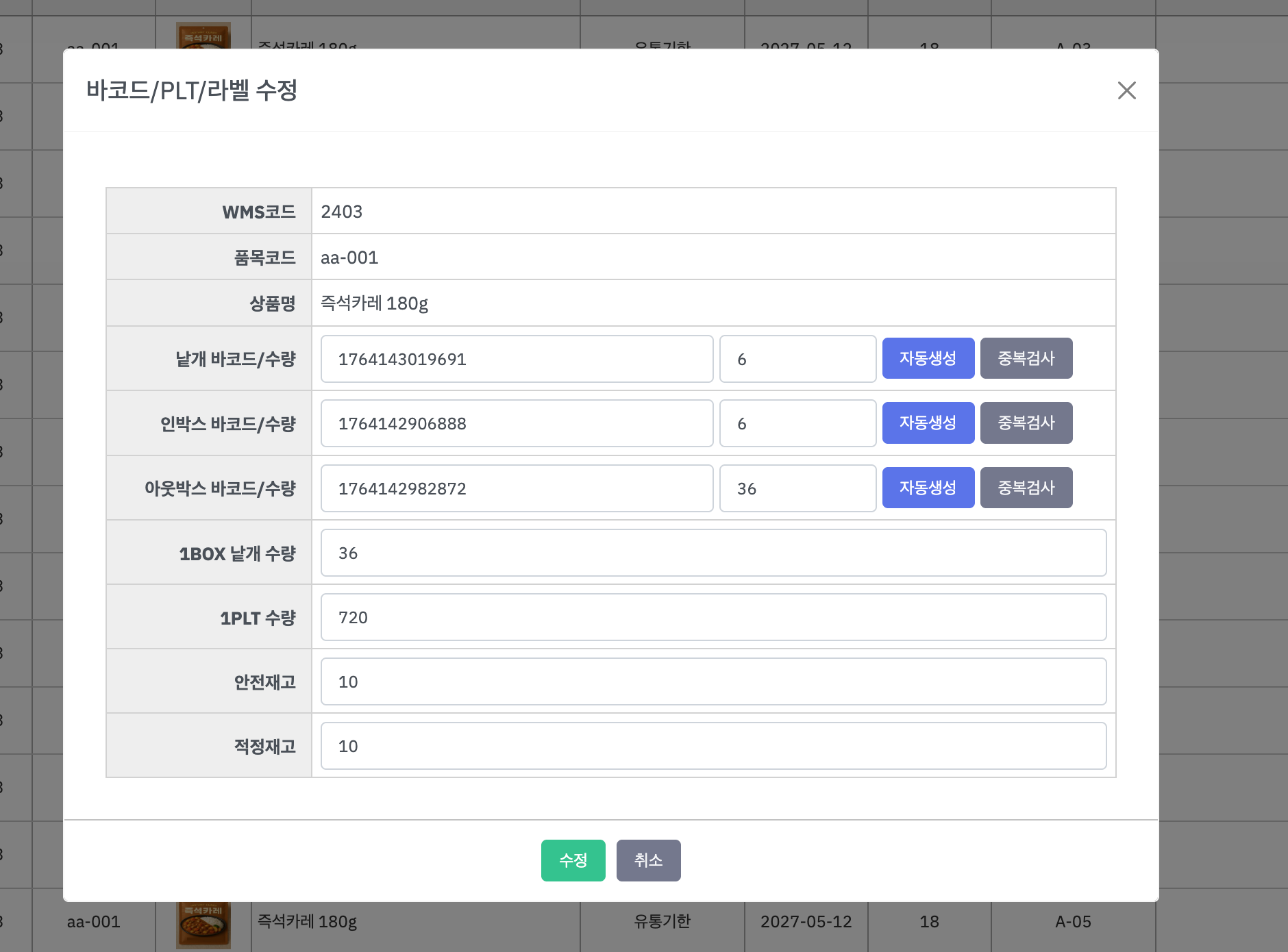 상품별로 박스 및 파렛트 단위 수량을 설정하여