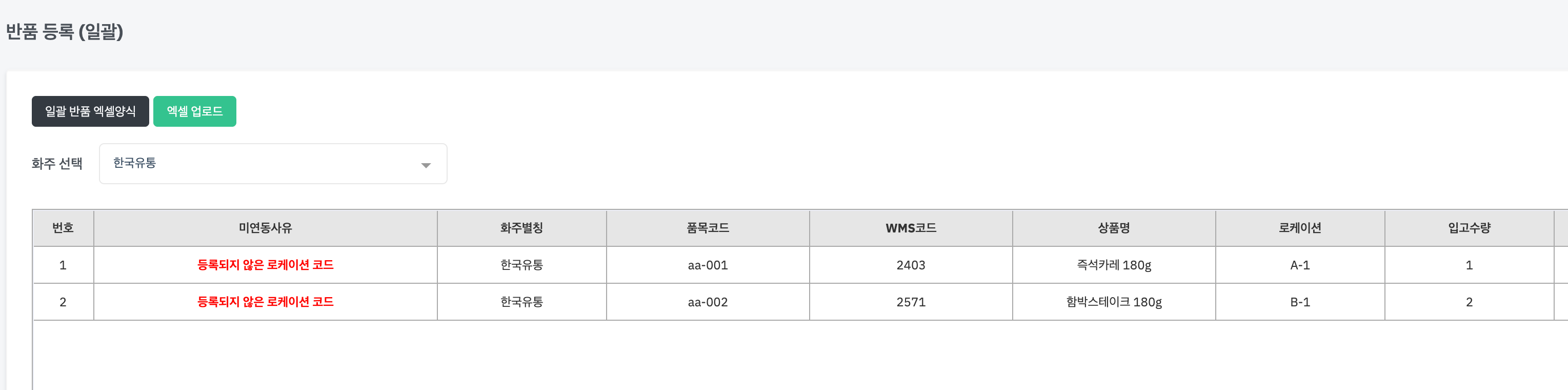 화주별칭, 품목코드, 로케이션, 입고수량, 상품 유통타입에 따른 LOT날짜(0000-00-00) 등 필수 항목을 정확히 입력해야 합니다.