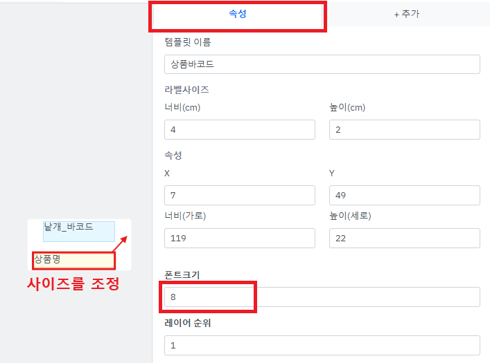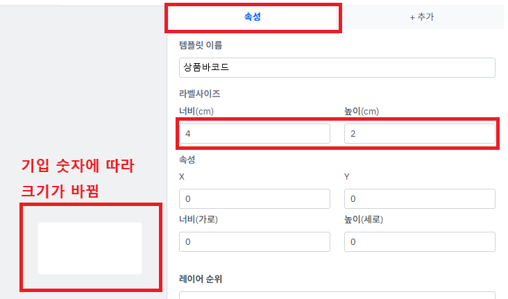 ⑤ [속성] 탭에서 라벨 사이즈를 기입합니다.
