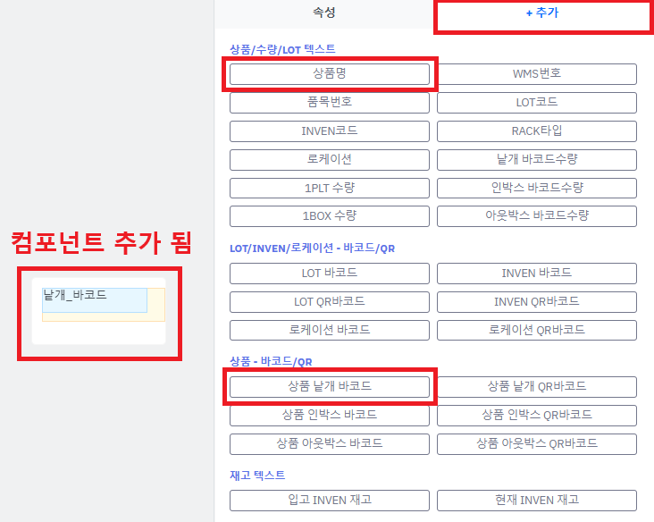 추천 컴포넌트는 [상품명], [상품낱개바코드] 두가지 입니다.