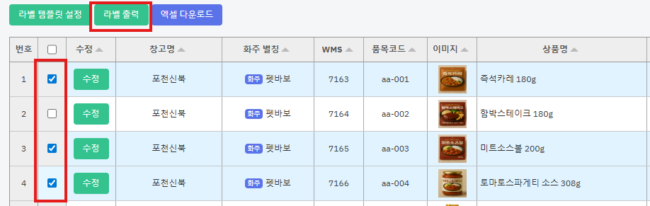 ① 출력하고자 하는 상품을 체크 후 [라벨출력] 버튼을 누릅니다.