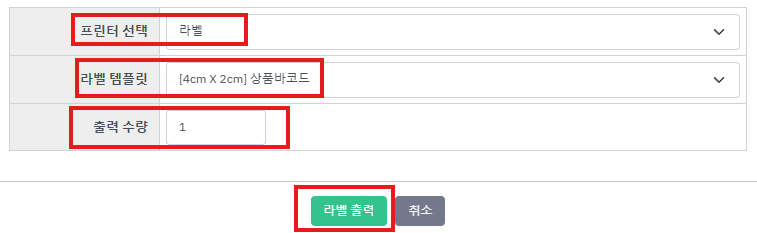 ② [프린터], [템플릿] 을 선택하고 [수량기입] 후 [라벨출력] 버튼을 누릅니다.